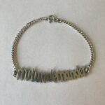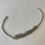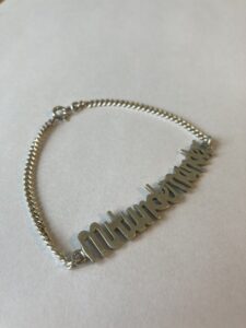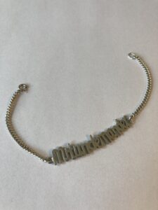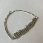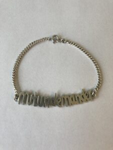 Dieses Armband enthält die Botschaft „Mitundeinander“. Die feine silberne Kette bildet einen Kontrast zu diesem auffällig großen Schriftzug. Diese Arbeit entstand entstand im Zuge der Corona-Pandemie, welche auch einen Anreiz zur Gestaltung gab. Hier ist Ihre Interpretation gefragt…
